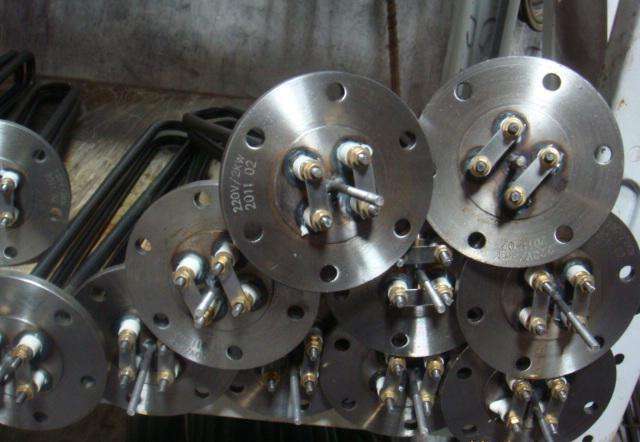 HRY1-護套式電加熱器(也稱插入式電加熱器):是采用U型管狀電熱元件,依據(jù)加熱不同介質(zhì)設(shè)計規(guī)范,按照功率配置要求裝配在法蘭蓋上,插入需加熱物料中,發(fā)熱元件工作時所發(fā)出的大量熱量傳導(dǎo)給被加熱介質(zhì)使介質(zhì)溫度升高,達到所需的工藝要求。當(dāng)介質(zhì)溫度達到工藝要求的設(shè)定值時,控制系統(tǒng)根據(jù)溫度傳感器信號,經(jīng)PID運算后調(diào)節(jié)電加熱器輸出功率,對發(fā)熱元件的電阻性負(fù)載實現(xiàn)溫度控制。使介質(zhì)溫度均勻,達到所需要求;當(dāng)發(fā)熱元件超溫或低液位時,發(fā)熱元件的聯(lián)鎖保護裝置立即切斷加熱電源避免發(fā)熱元件燒壞,延長使用壽命。法蘭式電加熱器是由多支加熱管焊接在法蘭上集中加熱,主要用于敞開式、封閉式的溶液箱和循環(huán)系統(tǒng)中加熱用。